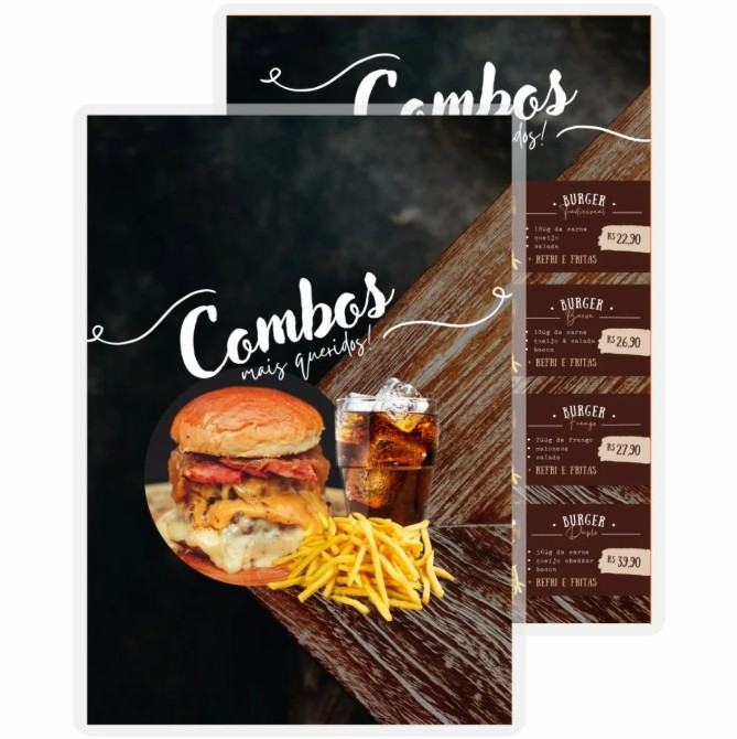 A plastificação transparente realça as cores e detalhes da impressão, além de facilitar a limpeza, tornando o cardápio ideal para bares, restaurantes, cafeterias e lanchonetes.